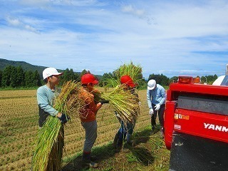今回は、脱穀の様子も見せていただきました。刈り取った稲束を大事そうに抱えて持っていくと、竹田さんが手際よくコンバインに入れて脱穀してくださいました。「稲を落とさないようにしようね」と声を掛けながら慎重に運ぶ子や、落ちた稲穂を1つ1つ拾い上げる子もいました。脱穀されたお米が袋いっぱいになる様子を見て、歓声を上げる子どもたち。貴重な体験をさせていただきました。