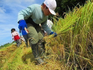 9/12秋晴れのもと、杉野瀬の棚田は一面黄金色に輝いていました。5年生は、お世話になっている杉野瀬の竹田さんの棚田で、昔ながらの手作業で稲刈りに挑戦。竹田さんから刈り方を教えていただき、張り切って稲を刈ること1時間。6列を刈り終えることができましたが、田んぼの半分にも達していませんでした。お米を生産するには、多くの作業を時間かけて行う必要があります。子どもたちは手作業の大変さを感じていました。