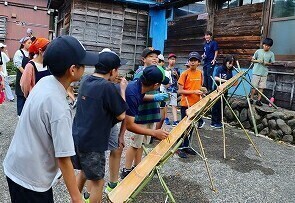 9/22、6年生は総合でかかわっている小林さんの空き家で、「夏を惜しむ会」を行いました。この日は、おうちの方や空き家活動を応援してくださっている地域の方もお招きして、賑やかな会となりました。最初はみんなで準備した竹の流しそうめん。そうめんを流す竹やつゆの器、箸もすべて名立の竹で作りました。自分たちで切った竹に流すそうめんの味は格別でした。