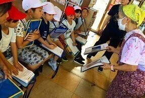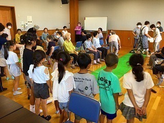 次に訪問したのは、名立コミュニティプラザです。名立区の人々の交流の場として子どもから大人まで多くの人に利用されています。職員の方が施設内のいろいろな部屋を案内してくださいました。また、みんなが楽しめる行事や活動もたくさん行われています。この日は、地域の方が集まってスカッとボールを楽しんでいる様子も見学しました。北部にはすてきなお店や施設があることを知り、うれしい気持ちになった子どもたちです。