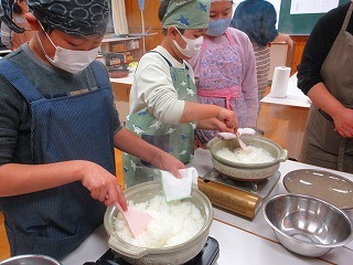 11月28日(金)、5年生が親子活動として「収穫祭」を行いました。この日は、田植えや稲刈りでお世話になっている竹田さんもご招待しました。9月に収穫したお米をよりおいしく味わうため、JAの方に教えていただき、土鍋を使ってご飯を炊きました。炊きたての新米で握ったおにぎりの味は格別です。親子でおかずやお汁も作って、みんなでおいしくいただきました。竹田さんも大変喜んでくださいました。