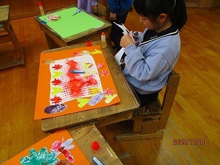 3、4年生は、上越教育大学の支援プロジェクトの院生から図工の学習支援を受けています。11月からは、版画の作品づくりに取り組んでいます。3年生は、宇山レンジャーズの活動を通して感じた宇山の四季を、スチレンボードで作ったスタンプで表しました。スタンプの形や色を工夫しながら楽しく制作しています。