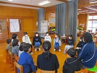 1、2年生はオープンスペースで丸くなり、順番に冬休みの思い出を紹介し合いました。家族で出かけた話やお年玉など、冬休みならではのエピソードがいくつも飛び出し、友達の話に興味津々の様子でした。