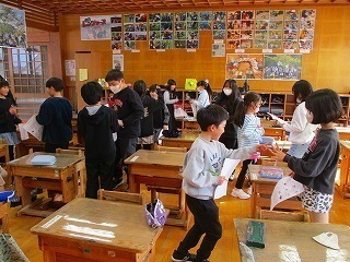 3、4年生は、「冬休みビンゴ」で盛り上がりました。写真は、「初詣に行った?」「おもち食べた?」と友達と質問し合っているところです。見事ビンゴになったらおみくじを引くことができ、子どもたちは大喜びでした。