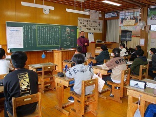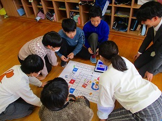 5年生は、冬休みすごろくをみんなで楽しみました。「冬休みの宿題いつ終わった?」「お正月に見たテレビ番組」など、とまったマスに書いてあるお題で盛り上がっていました。