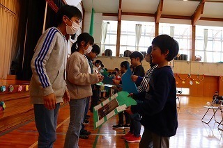 3月3日(火)に、「6年生ありがとう集会」がありました。全校のリーダーとして宝田小を引っ張ってくれた6年生に「ありがとう」の感謝の気持ちを伝え、全校で楽しい時間を過ごすことができました。5年生は会の企画と運営に取り組みました。1、2年生は手作りの招待状、3、4年生はメダルとメッセージカードのプレゼントと、それぞれの学年が6年生のために心を込めて準備しました。6年生からの出し物では、つばさ学年の6年間を劇にして発表してくれました。ユニークで、懐かしさが感じられるつばさ学年のよさが詰まった発表でした。笑顔がいっぱいの温かい集会となりました。