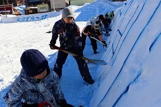 6年生は、灯の回廊の準備に参加しました。写真のように、雪の壁に字を書くために、スコップで雪を掘りました。しかし、雪がカチカチに固まっていたので、なかなかスコップが入らず、みんな大粒の汗をかきながら懸命に作業を続けました。活動を通して、地域を盛り上げるために、大変な作業をしている人の存在に気が付きました。また、翌日、自分達がほった文字がきれいに灯されているのを見て、「名立(名南)全体が明るく、あたたかくなった感じがしてうれしかった。」と振り返っていました。