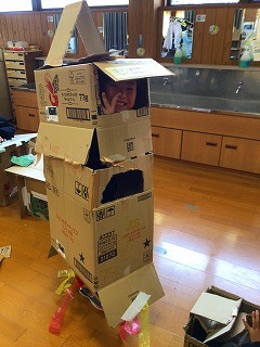 1、2年生は図工の時間にダンボールを使った工作に取り組みました。ダンボールの中に入るといろいろな思いが膨らみ、ロケットやロボット、車、おうちなど、自分が入ってみたいものを次々とつくりました。友達と一緒につくっては遊ぶを繰り返し、存分に楽しみました。
